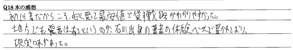 大きく失敗しないように、本の通り、一つずつ積み重ねていきたいと思います。(東京都千代田区/M.Hさん)